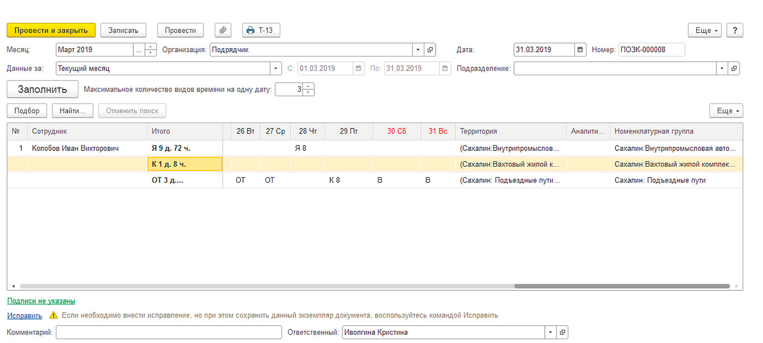 - Отражение в табеле учета рабочего времени количества часов, отработанных сотрудниками на различных объектах строительства.
